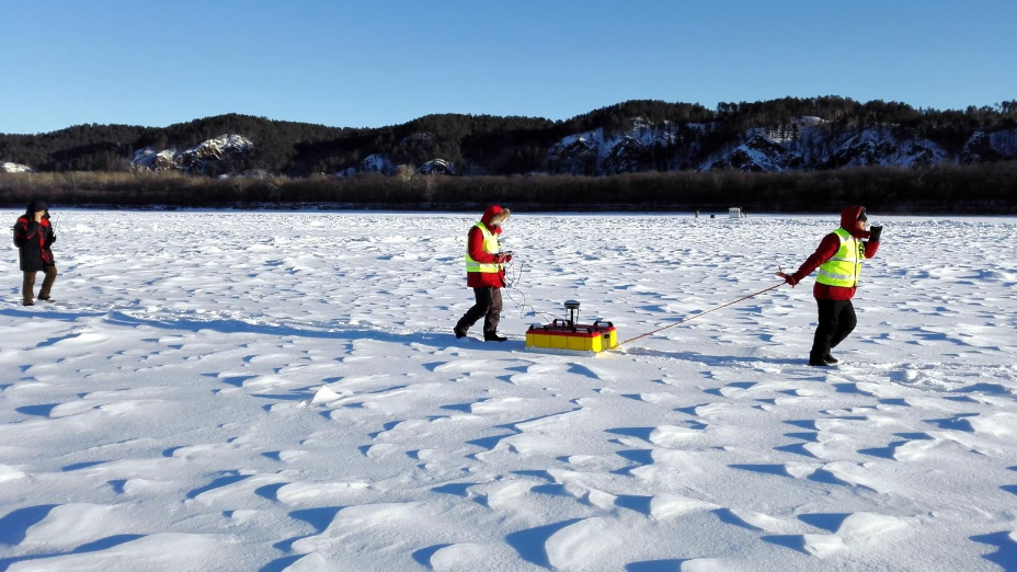 圖1? 冰厚水深綜合探測雷達在黑龍江漠河北極村段現(xiàn)場作業(yè)