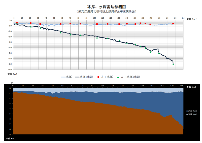 圖3 雷達獲取的高精度冰厚水深綜合斷面圖(與傳統(tǒng)方法測量數(shù)字比對,測量結(jié)果更精準)